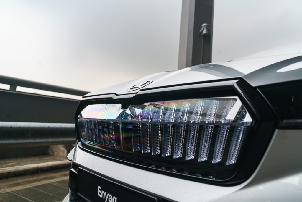 While there is that real risk that EVs can become as utilitarian as white goods, the Enyaq stands out with its distinctive ‘Crystal Face’ grille; where it incorporates 130 LEDs to produce animated light sequences, for a warm-welcoming effect. This, together with a bold, high-waisted side profile, makes for a strong road presence. This example, which is the Sportline variant, is accentuated by its 20-inch ‘Vega’ Anthracite alloy wheels and black detailing. To cap things off, the rear sports “pincer-shaped” LEDs, complete with dynamic turn indicators.