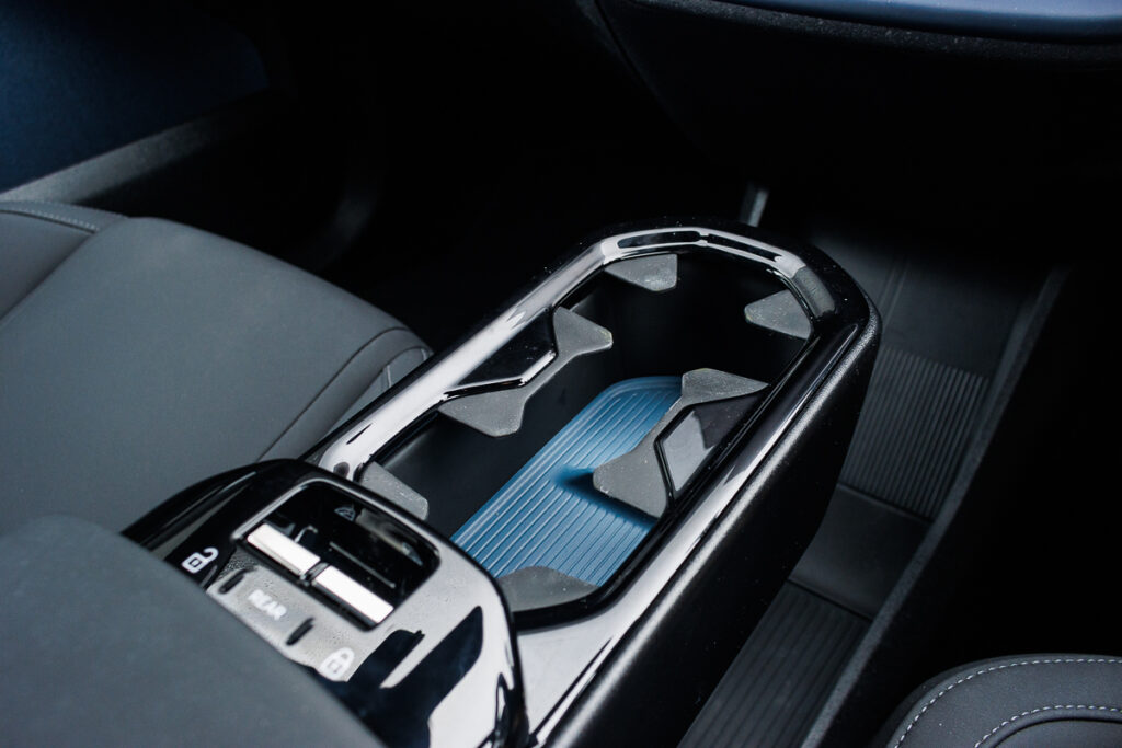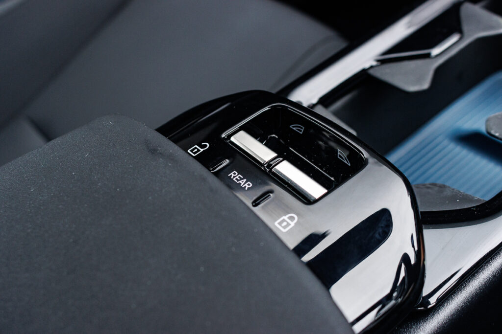 Oddly, the front window switches are located on the central armrest, which also houses a retractable cup holder/tray. In order to operate the rear windows, youโd need to depress the โRearโ button, before lowering them – somewhat like in the Volkswagen ID.5 GTX, Skoda Enyaq, CUPRA Tavascan and the Audi Q4 e-tron. I mean, why cut the button count?