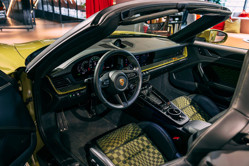 Just like the Spirit 70, the Turbo 50’s dashboard, glovebox and seat backrest inlays come with its own special trim, with this model sporting an elegant tartan design pattern. The steering wheel has the historic Porsche crest, while the Porsche Exclusive Manufaktur logo is embossed in the leather on the centre console storage compartment. The instrument cluster dials and the Sport Chrono clock in the Heritage Design Package are finished in green.