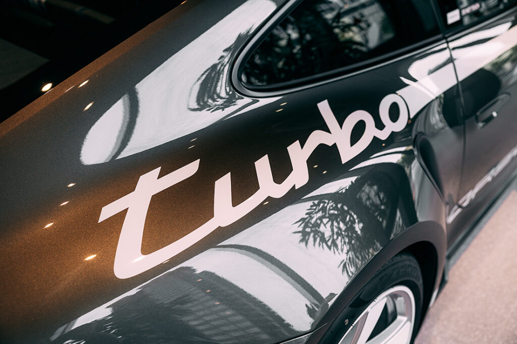 Another nostalgia-evoking reference is the historic colour, Anthracite Grey, that can be found on various parts of the body. The rear engine cover grille also features a turbocharger icon and commemorates the Turbo lineage from 1974 to 2024. Open the door and you’ll even be greeted with the image of a turbocharger on the ground, cast from the Turbo 50’s LED door projector.