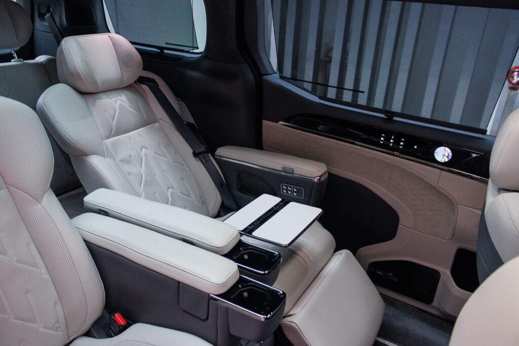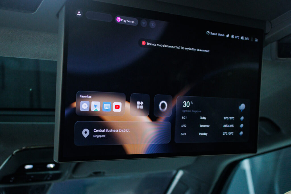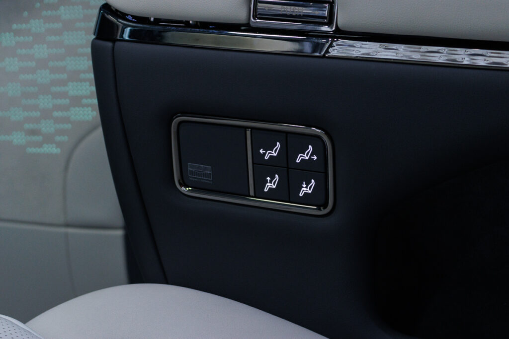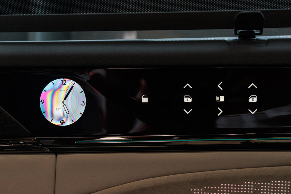 Like all luxury MPVs, the middle row has the best seats. In the ZEEKRโs case, the left seat would be dank, as it also has a footrest, which is deployed from the front passenger seatback. I particularly like the small touchscreen clocks on both the door cards, whcih swipe to reveal individual climate control and seat memory. Also on the panel, there are controls for the power windows. Both seats also have their own physical function controls, which allow you to toggle the reclining angle, and very importantly the massage intensity.