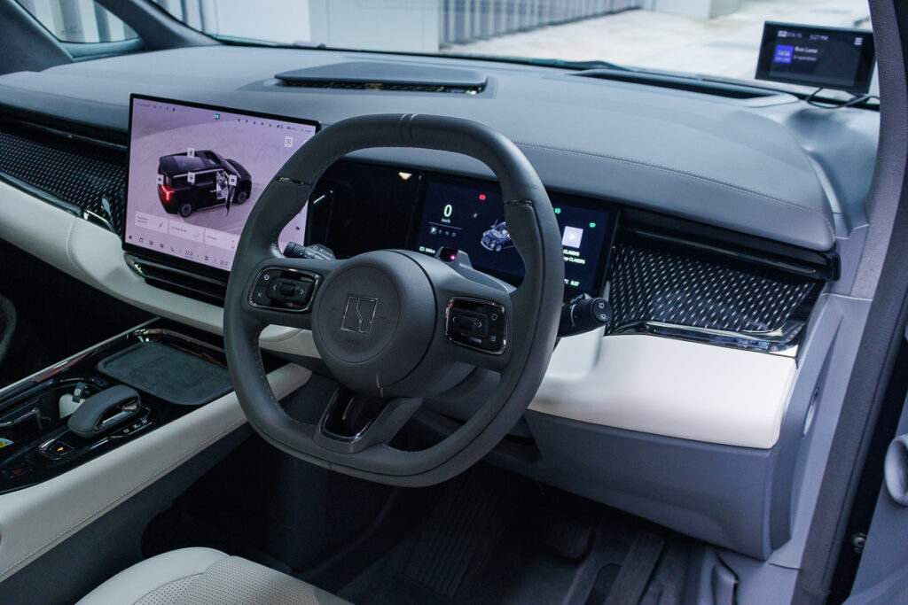 The dashboard is a neat and uncluttered affair, where its โbarely thereโ air-conditioning vents, is a pleasant touch. A 15-inch super-sharp 2.5K OLED infotainment touchscreen whcih sits in the middle of the dash, is driven by a Qualcomm Snapdragon 8295 chipset, which generates quick and smooth transitions. It also has pretty good voice-assistance, although it still pales in functionality (and humour) in-comparison to those found on higher-end BMW and Mercedes-Benz cars.