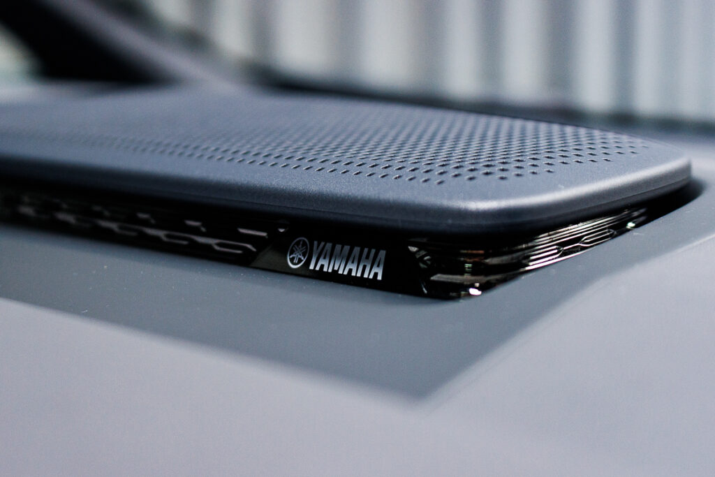 Premium audio is from a 30-speaker Yamaha system, which includes speakers mouted in the front and middle row headrests. Where serenity is paramoint, the navigational instructions can be piped solely into the driverโs headrest.