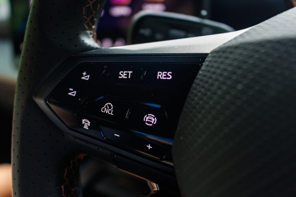 The steering wheel functions are haptic-touch, which takes a bit of getting used to, since some functions respond better from sliding up and down, others from pushing left and right. A little quirky, but nothing too serious to dampen the car’s vibe, except for occasionally getting in the way when you turn a corner.