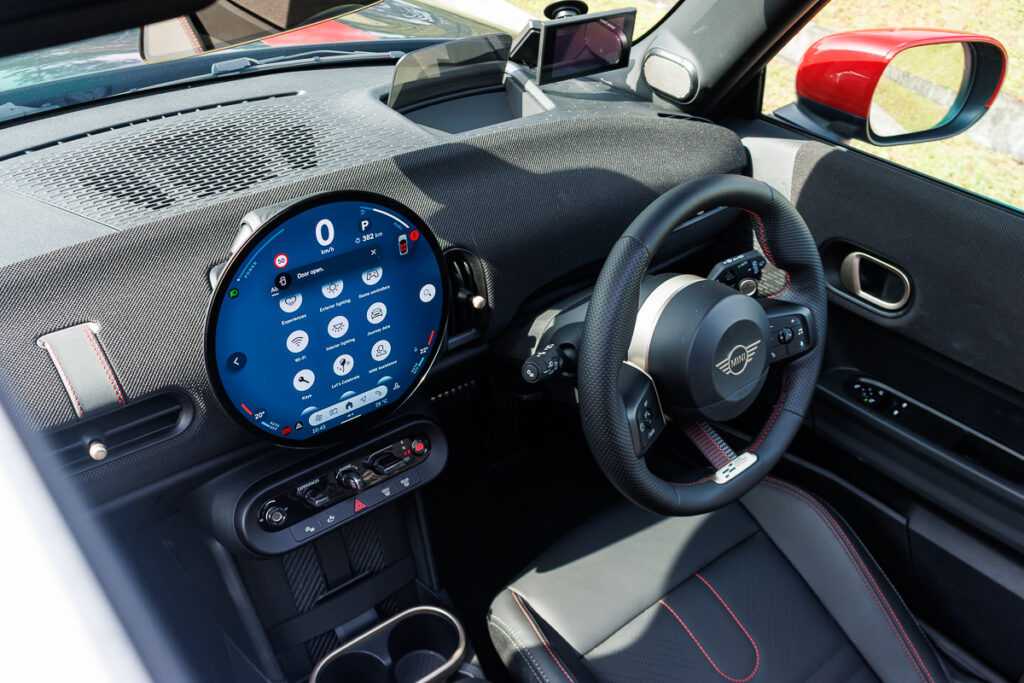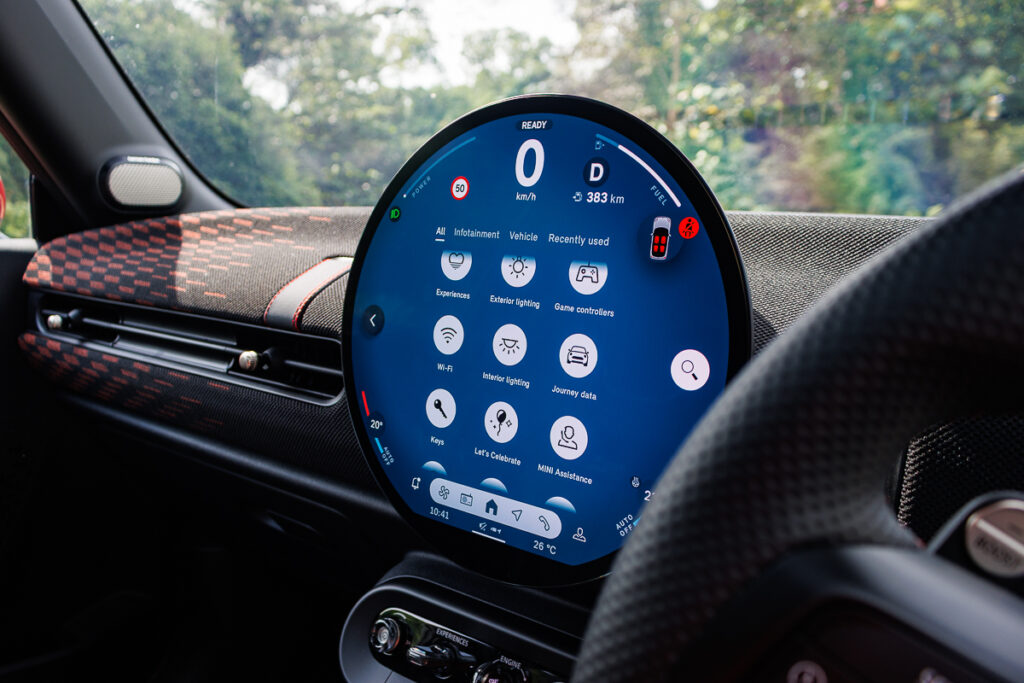 Compared to the previous iteration of the John Cooper Works hatchback, a lot has changed on the inside. There is plenty in the way of woven fabric lining the new dashboard. It is in a way less like how you’d traditionally see a car if you may. And if you were to squint, the dashboard has just a tinge of 70s hi-fi entertainment centre worked into its design.