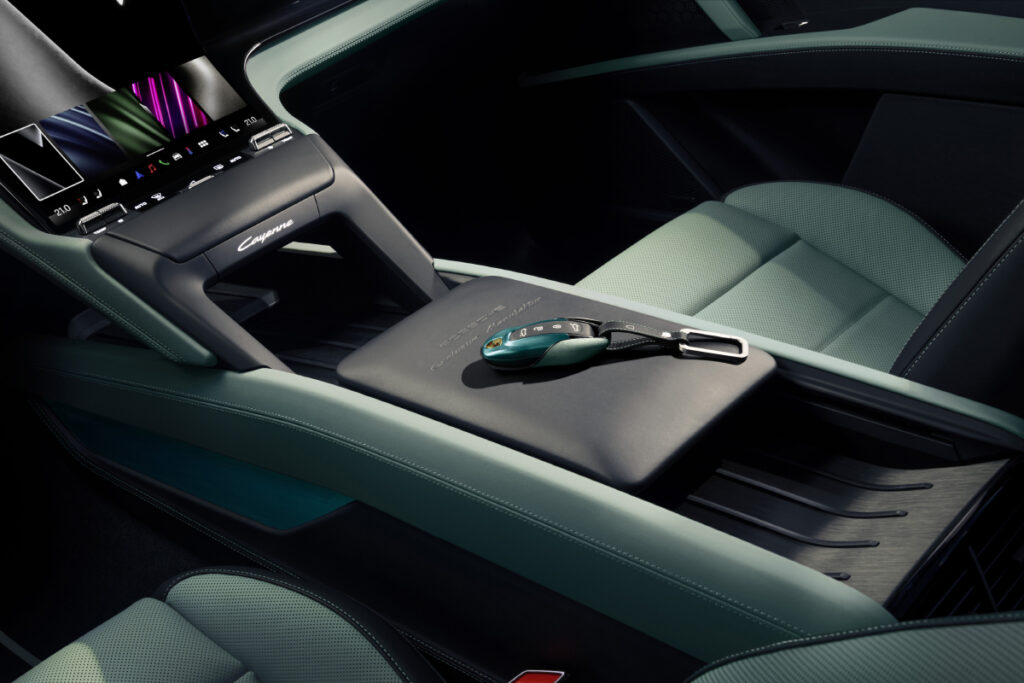 The features are complemented by an accent package in Silvershade, as well as an armrest in the centre console embossed with ‘Porsche Exclusive Manufaktur’ lettering. The vehicle key is also finished in Izabal Green and is presented in a case with decorative stitching in Delgada Green. The overall look is rounded off with black anodised aluminium door sill guards with the model designation illuminated in green, as well as black floor mats with decorative edging, emblems and stitching.